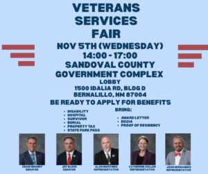 The New Mexico Department of Veterans’ Services (NMDVS) has joined New Mexico Legislators for a veteran service event on Wednesday, Nov 5, 2025, from 2-5 p.m. at the Sandoval County Government Complex, 1500 Idalia Rd, Bldg. D, Bernalillo, NM 87004. The event is designed to provide valuable resources and benefits for veterans in Rio Rancho and surrounding communities.