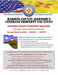 The New Mexico Department of Veterans’ Services (NMDVS) will be at the Harding County Community Building, 557 Wagon Mound Highway, Roy, NM 87743, from 9 am -3 pm.