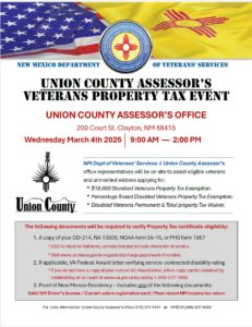 The New Mexico Department of Veterans’ Services (NMDVS) will be at the Union County Assessor’s Office Building, 200 Court Street, Clayton, NM 88415, from 9 am -2 pm.